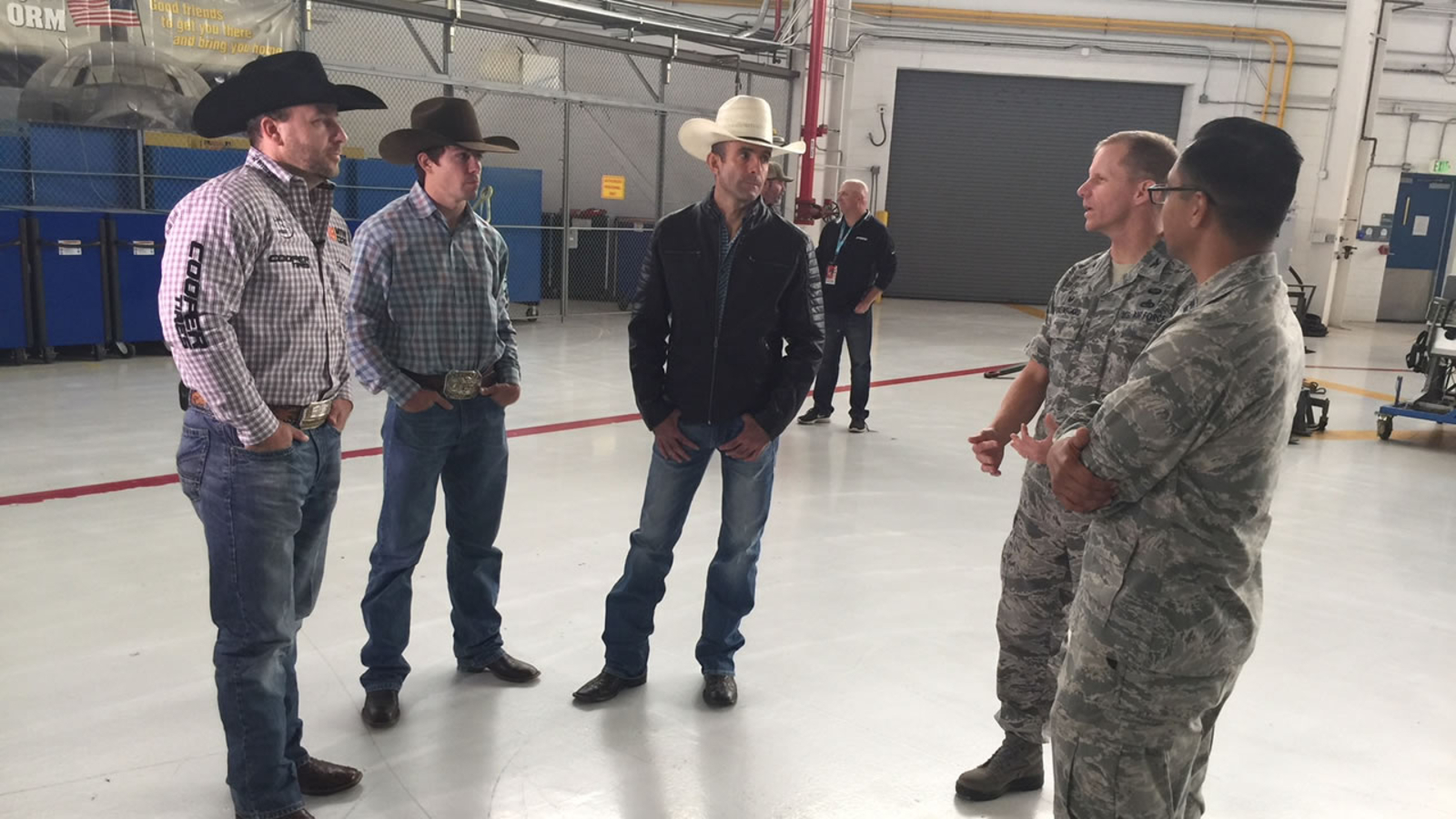 The maintenance hangar at Moffett Air National Guard Base near Mountain View had special visitors today -- Francisco Morales and Lachlan Richardson, two members of the Professional Bull Riders, who will be competing Saturday night and Sunday afternoon at San Jose's SAP Center, plus announcer Matt West. A