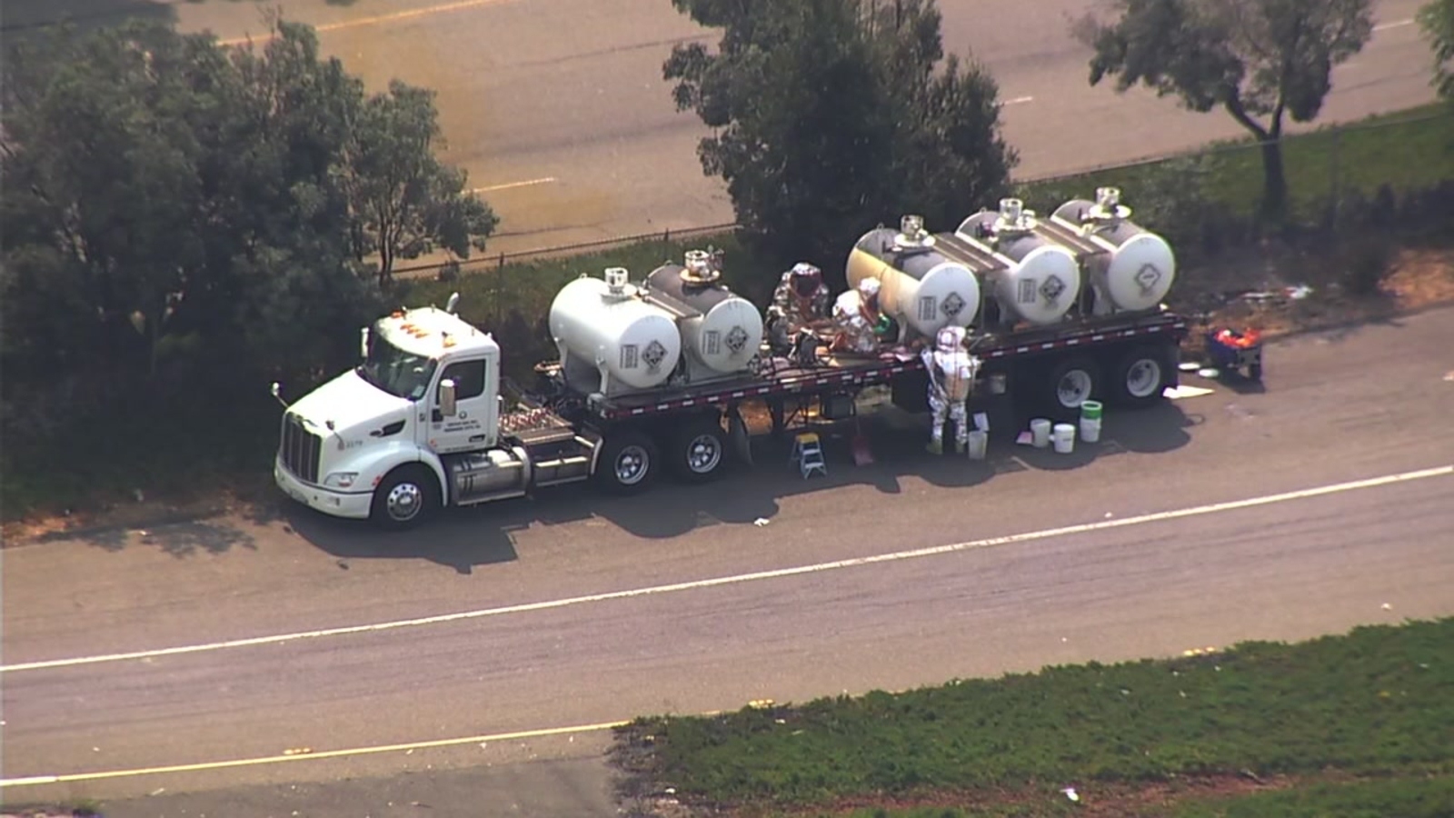 Earlier, acid was smoldering and putting up orange smoke on the southbound shoulder.