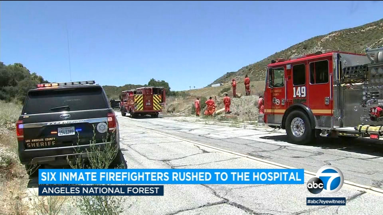 ANGELES NATIONAL FOREST, Calif. -- Six inmate firefighters were rushed to the hospital for burn injuries they suffered in a flash fire in the Angeles National Forest Tuesday.