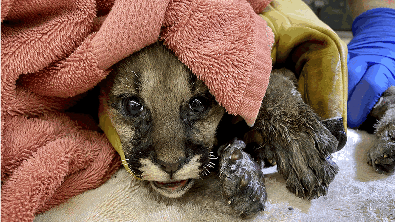 The male cub, weighing just under four pounds, suffered severe burns to his paws and whiskers and irritation to his eyes, though a veterinarian with the Oakland Zoo said the cub is showing "promising signs" for recovery.
