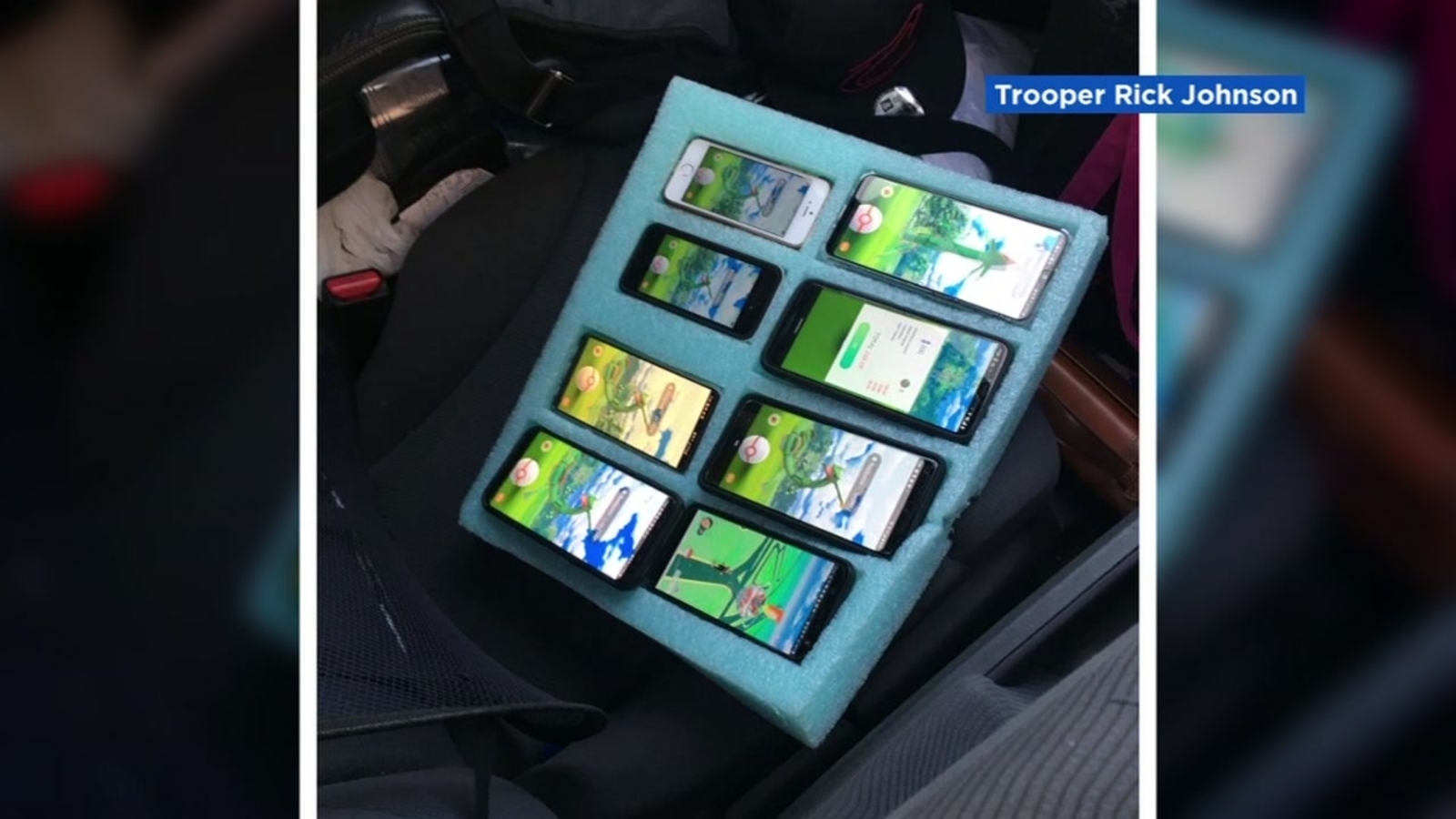 A sergeant approached a car stopped on the shoulder and found not one, not two, but eight phones playing Pokemon Go.