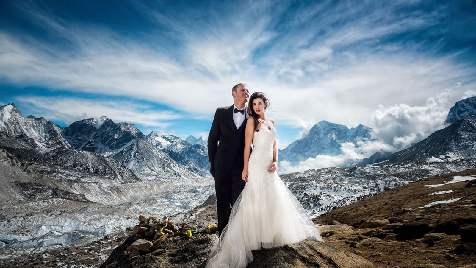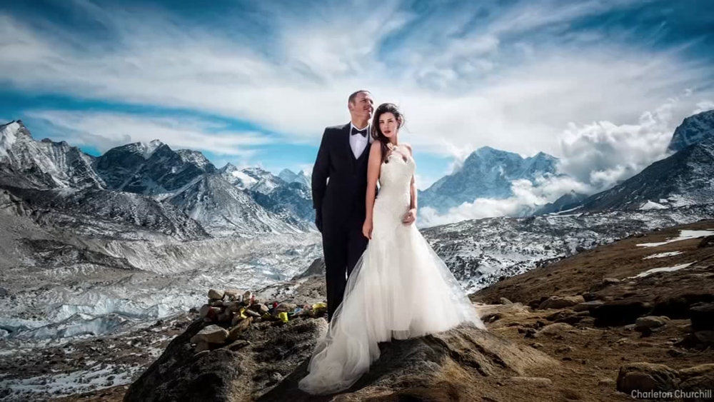 NEPAL (KGO) -- Sacramento couple Ashley Schmieder and James Sissom were married at Mt. Everest Base Camp, becoming the first couple to exchange vows there in a wedding gown and tuxedo.