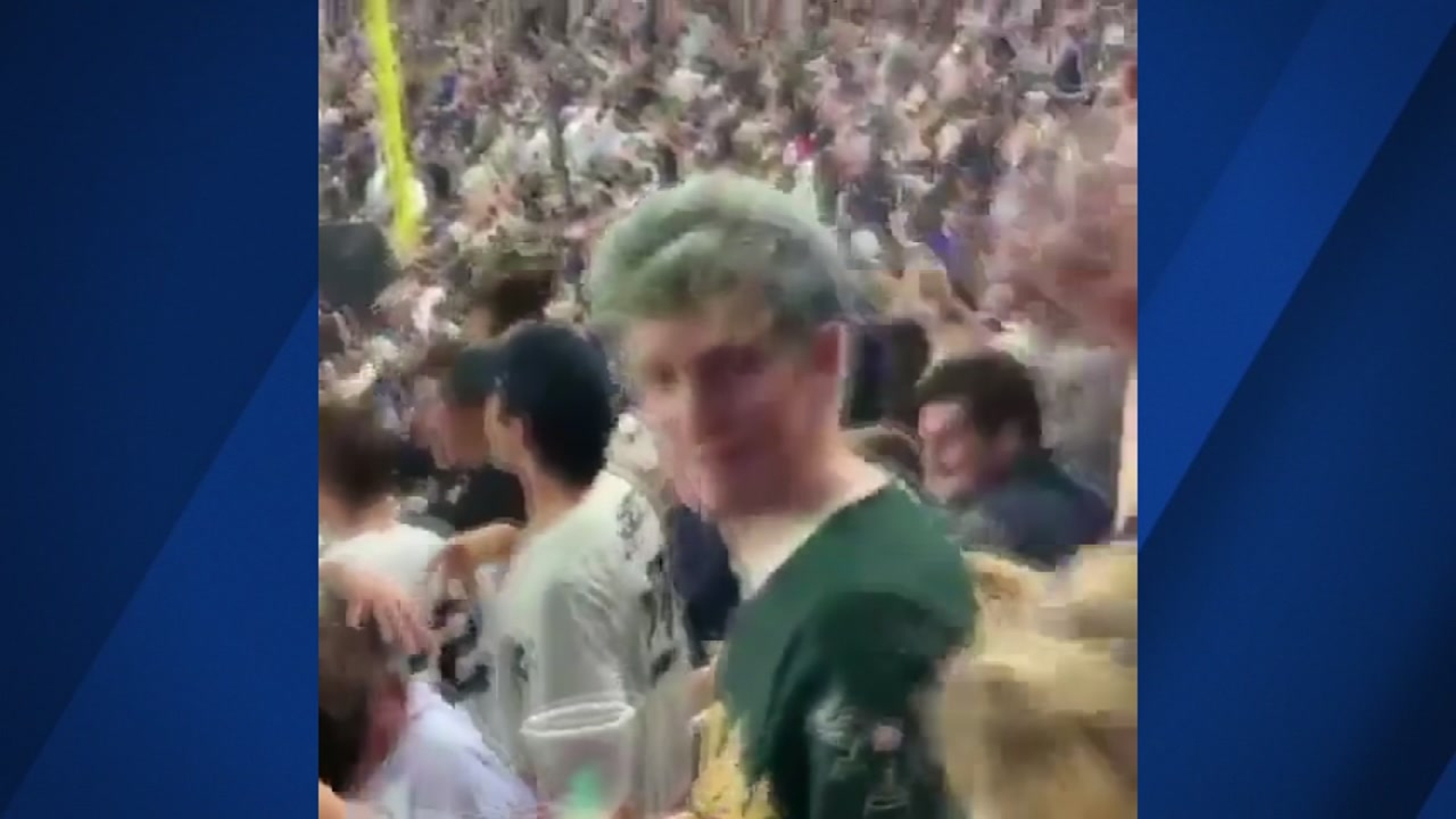 NEW YORK (KGO) -- An Athletics fan was doused with beer by a Yankees fan at a game between the two baseball teams on Wednesday night, as seen in a video that was shared on Instagram by user Chris Crak.