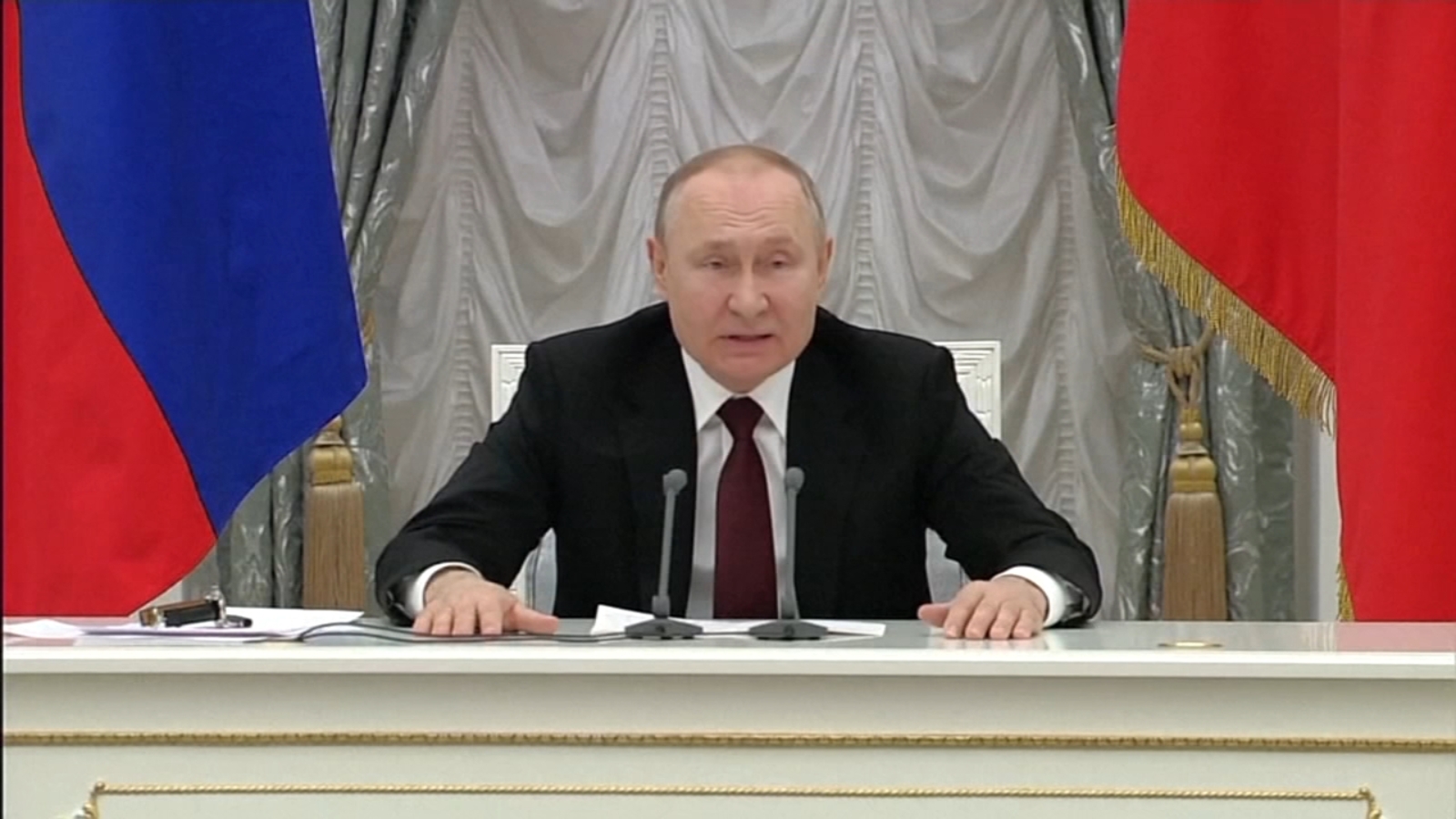Russian President Vladimir Putin signing a decree recognizing independence for Donetsk and Luhansk, two Ukrainian regions at the center of an ongoing conflict between the two Eastern European nations.