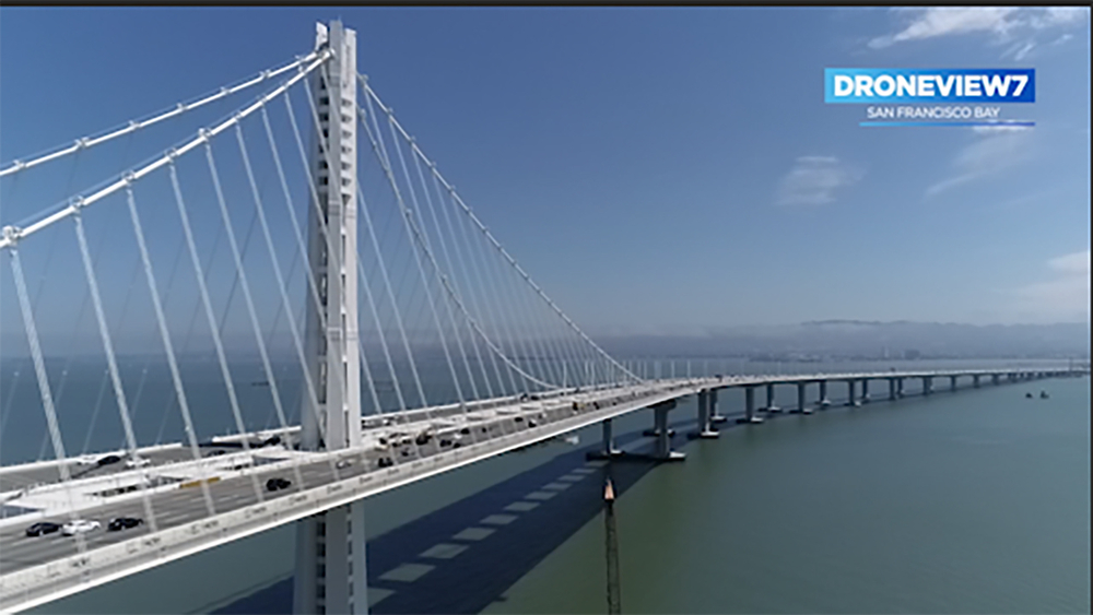The structure rests in full view of the San Francisco skyline and the still-existent suspension span of the Bay Bridge.