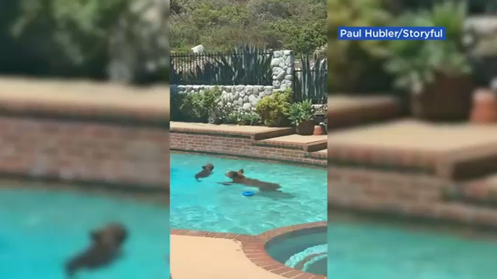 Video recorded by Paul Huber caught two bears enjoying an afternoon swim in his backyard poll in Glendale, California on July 2.