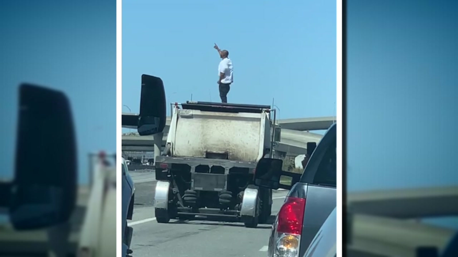 It's not clear what led up to this, but police surrounded a dump truck on the freeway with a man who had gotten out and climbed on top of a pile of what looked like gravel or asphalt in the back.