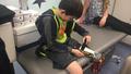 When he arrived at Oracle Arena, he was quickly escorted through the crowds and down to the court. Formaker's prosthetic leg works very well with his re-attached and rotated foot.