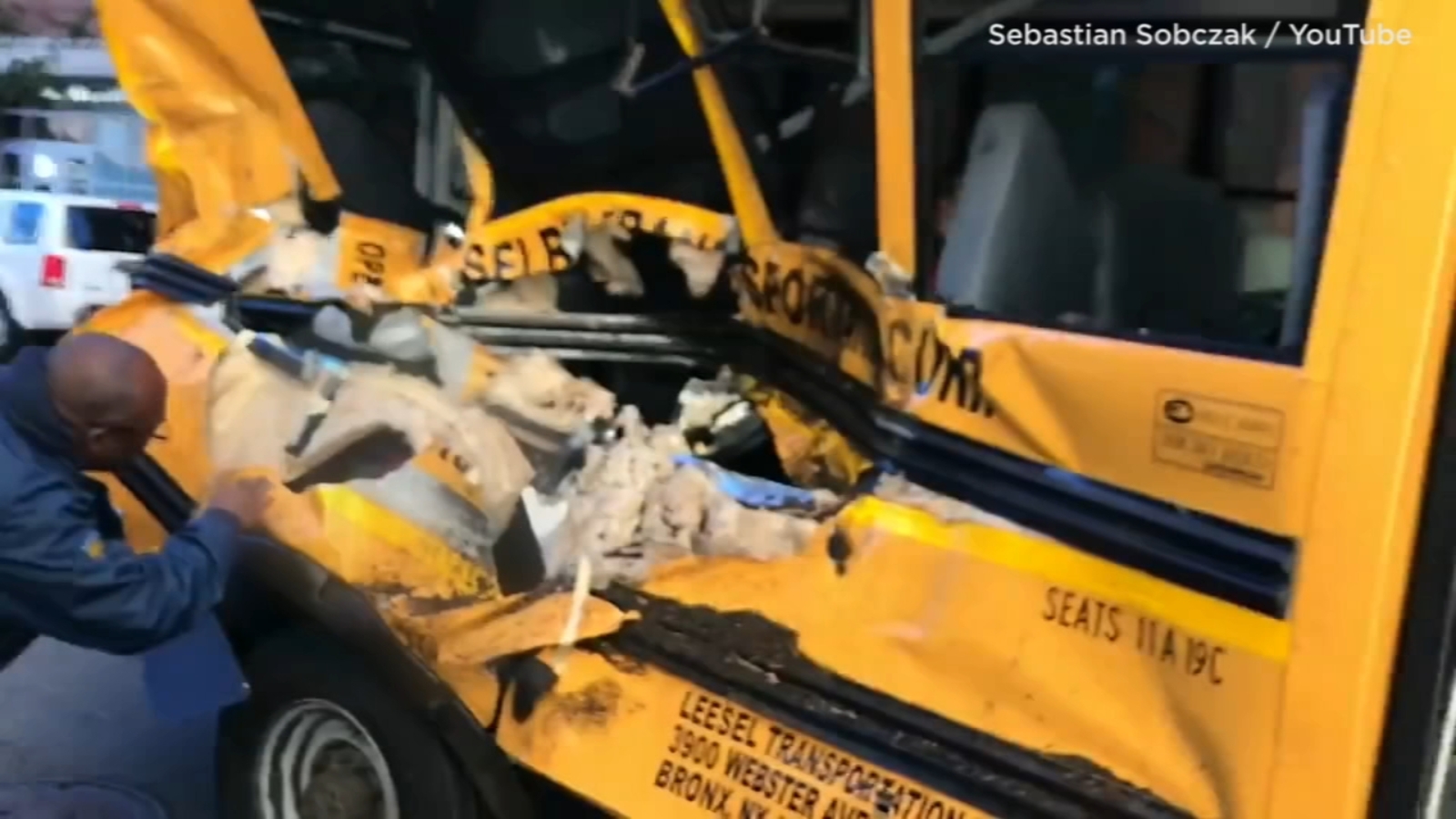LOWER MANHATTAN, New York -- Dramatic video shows the mangled yellow school bus with children on board after it was struck by a terror suspect driving a pickup truck in Lower Manhattan Tuesday.