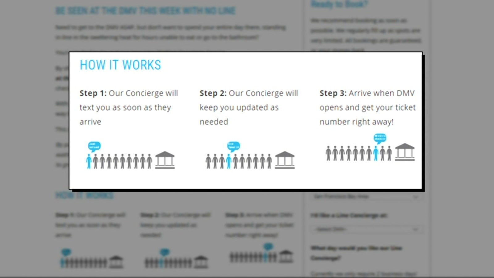 The service will have a concierge text you when they get to the DMV. They'll update you as needed. You show up when the DMV opens and you'll get your ticket number immediately.