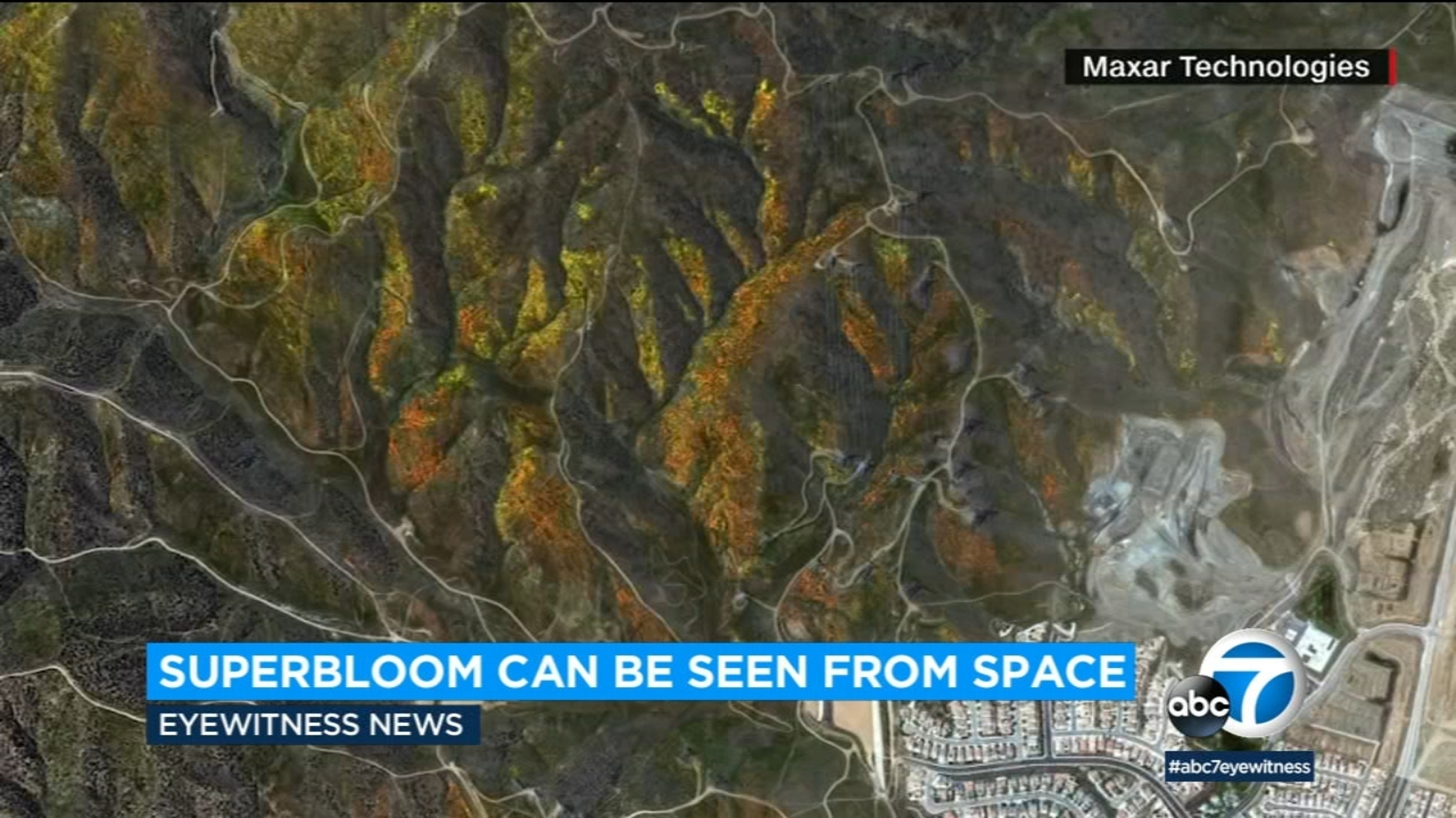 The wildflower takeover is dominating hillsides so intensely that the blooms are visible from space. Streaks of poppy orange and bright, lemony yellows can be seen in satellite imagery across canyons and hilltops that for years have been brown, barren areas, making the transformation that much more impressive.