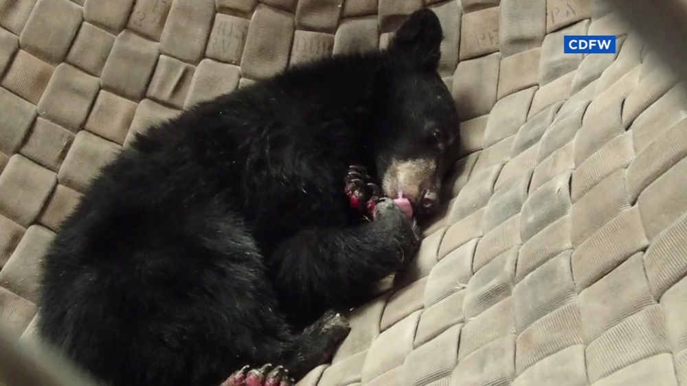 A crew working to fix damaged utility poles spotted the bear a month ago licking its burned paws.