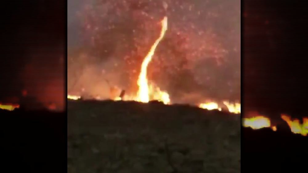 The fire whirl captured in this video sent sparks shooting out in all directions as it towered above the trees.