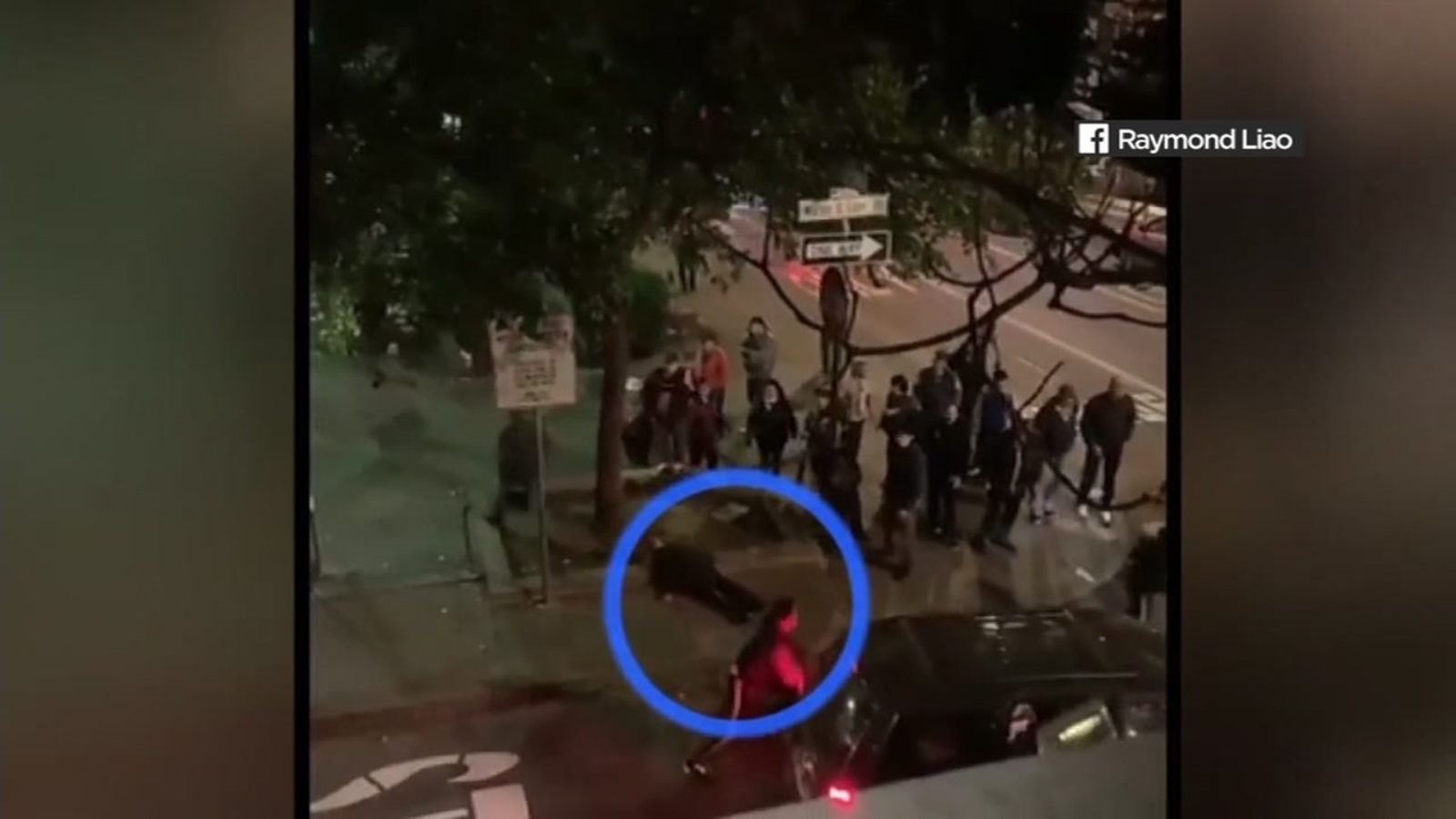 Two other victims are seen being punched and knocked to the street. Moments later, the suspects take off down Clay Street in a black SUV.