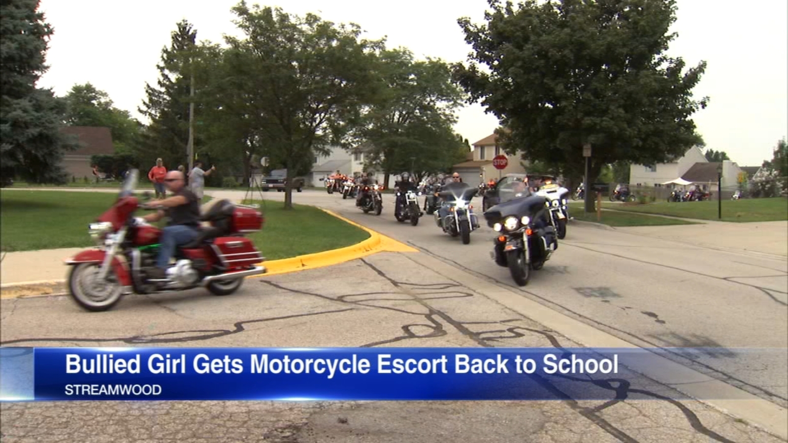 STREAMWOOD, Ill. -- A middle school student who had been badly bullied last year was escorted to her first day of classes Monday by a group of bikers.
