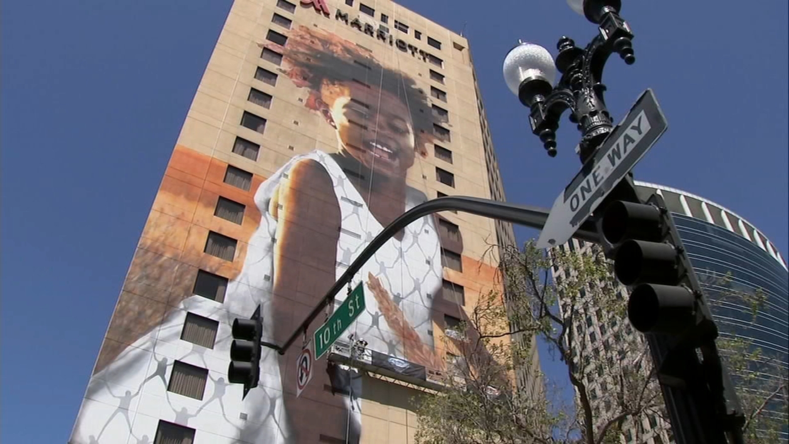 The piece by artist Victor Ash is going up on the 21-story wall of the Marriott Hotel.