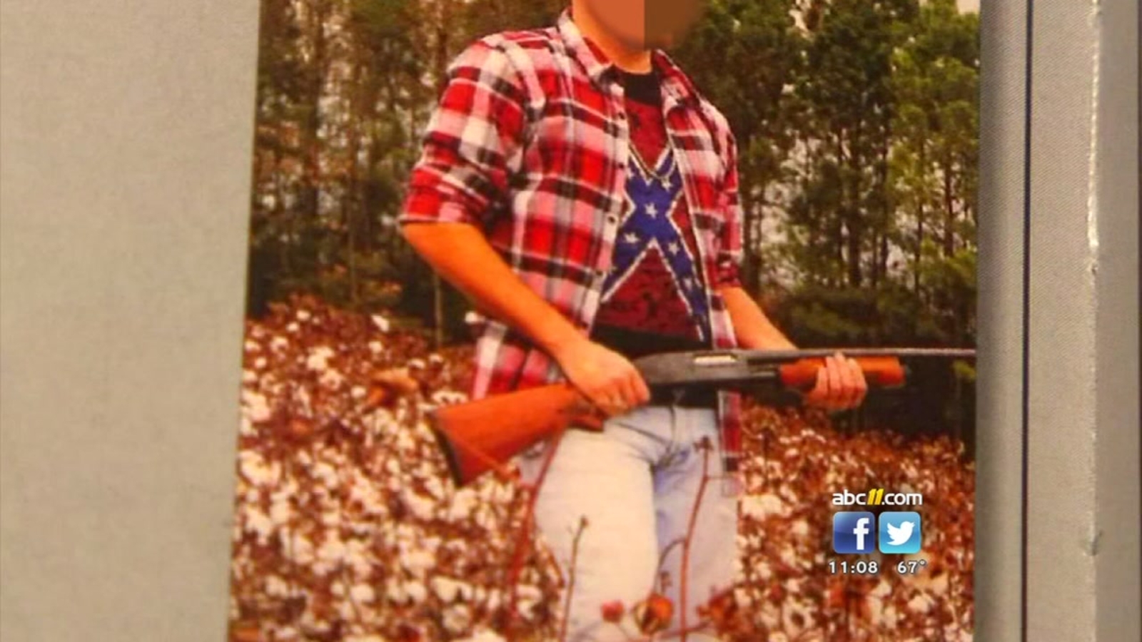 FAYETTEVILLE, NC -- A yearbook picture at a Cumberland County school is stirring up controversy. Some parents and students say they're horrified after seeing a picture of a student wearing a Confederate flag shirt, holding a gun while standing in what appears to be a cotton field.