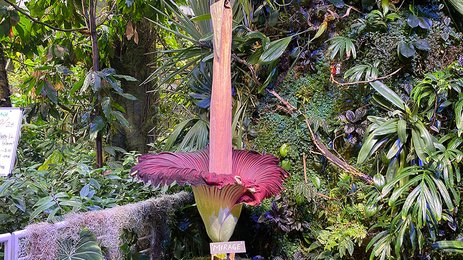 Stacking up to nearly seven feet at its peak, nestled into what's known as the Osher Rainforest, after five years of quietly growing and storing energy underground, the corpse flower known as "Mirage" stole some thunder from its talkative parrot neighbors, and finally started blooming Tuesday afternoon.