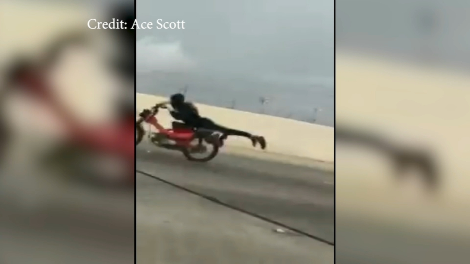 The video shows a motorcyclist pulling off a stunt known as the Superman. The biker lays on his stomach and lifts his arms and legs in the air.