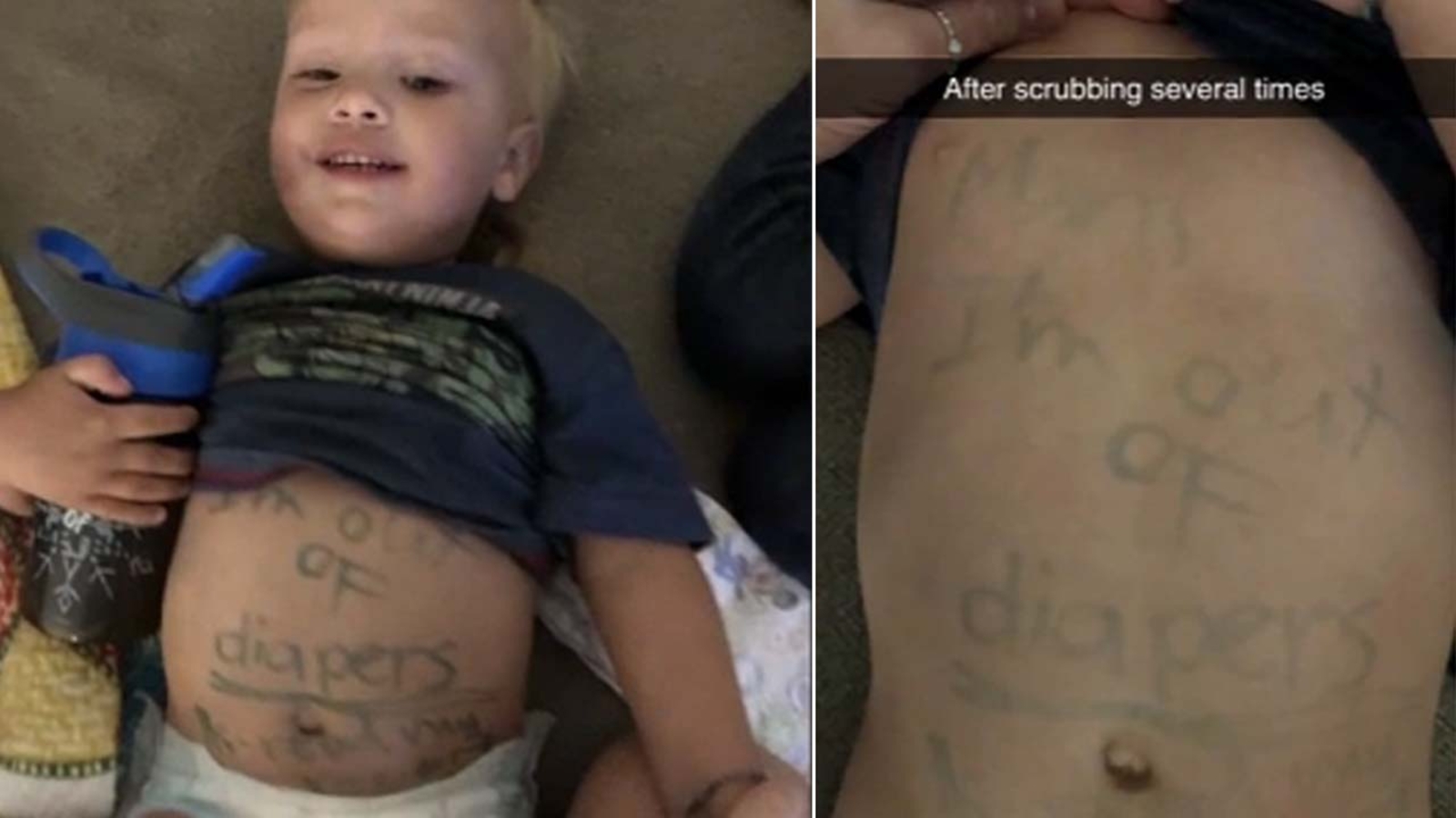"I've given him two showers and scrubbed his stomach, and it's not coming off," Chisum said.