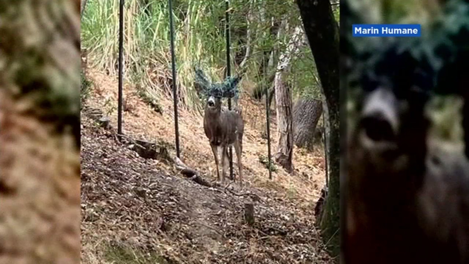 SAN ANSELMO, Calif. (KGO) -- It's not quite a red-nosed reindeer but a deer in San Anselmo did get a bit wrapped up in the holiday season.