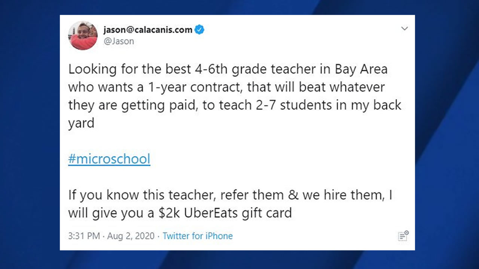 "Looking for the best 4-6th grade teacher in Bay Area who wants a 1-year contract, that will beat whatever they are getting paid, to teach 2-7 students in my back yard," tweeted Jason Calacanis.