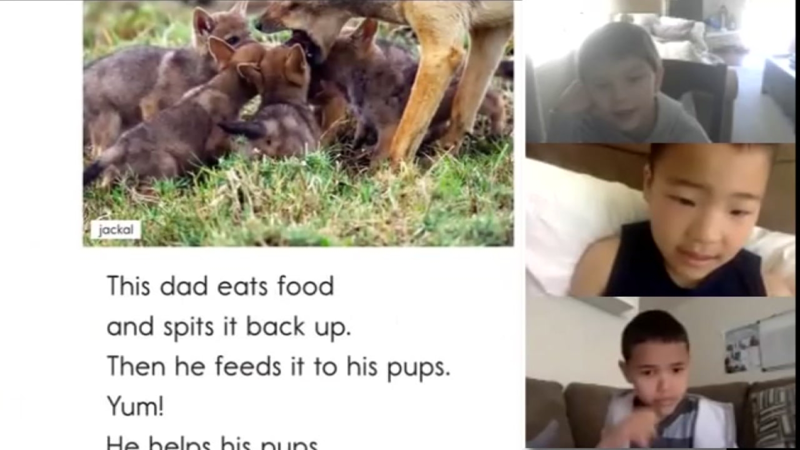 Susan first gives a book introduction, then highlights some tricky words and talks about why she chose the book. She says it's similar to how she would teach reading in a classroom. She's able to mute some children so she can listen to just one, or unmute everyone so all the kids can read together.