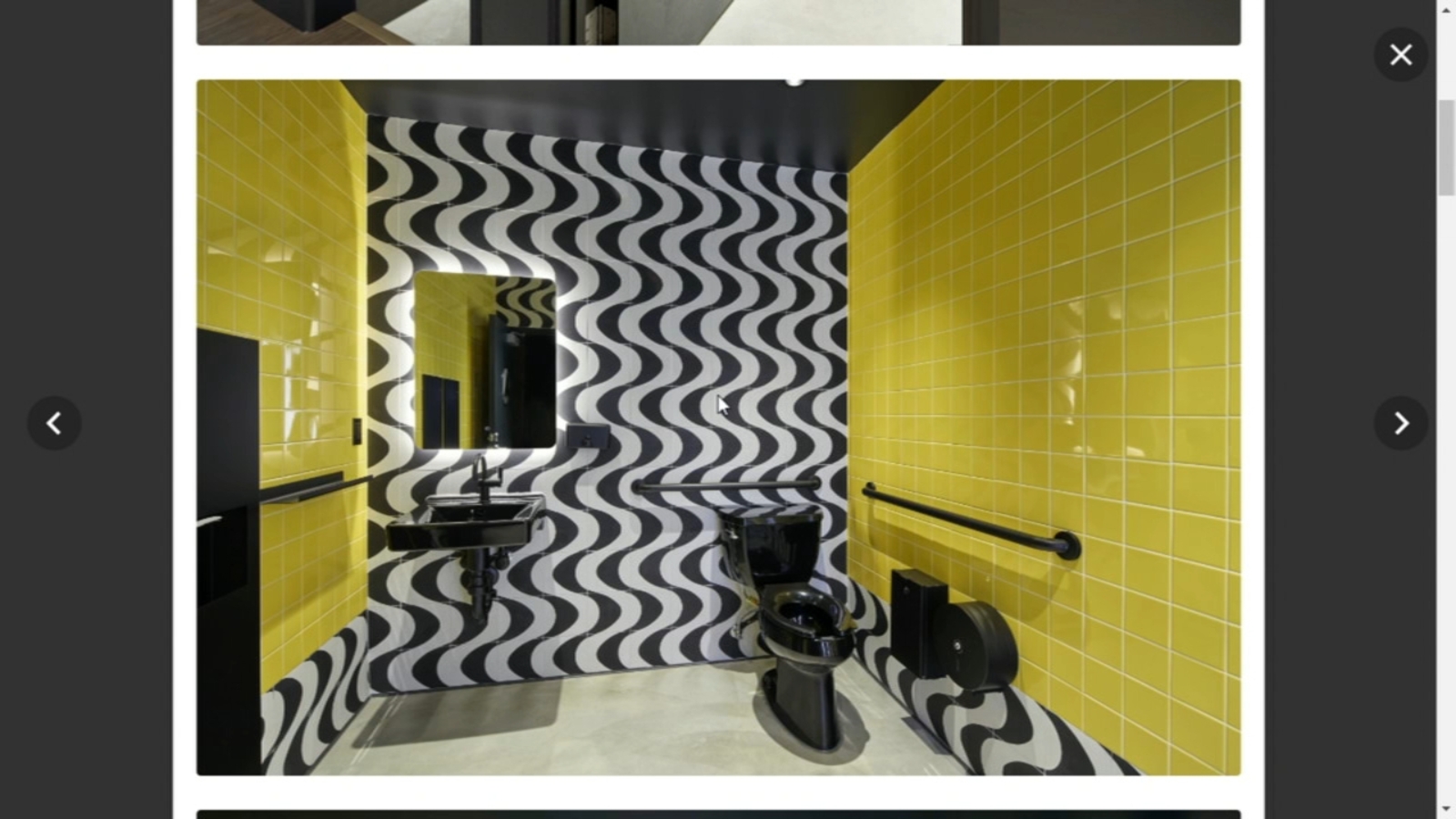 It features ADA-accessible, unisex stalls with vibrant yellow tiles and a black-and-white wave design.