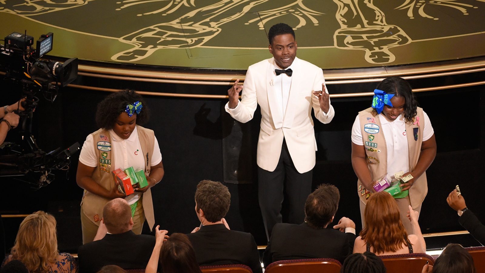 Rock brought out what he said was his daughter's Girl Scout troop during the Oscars, who then ran through the aisles, trying to sell cookies to smiling stars.