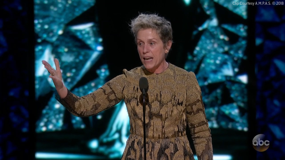 She ended by saying "inclusion rider," which is a belief that actors push for stipulations in contracts that can provide gender and racial diversity while hiring on sets.