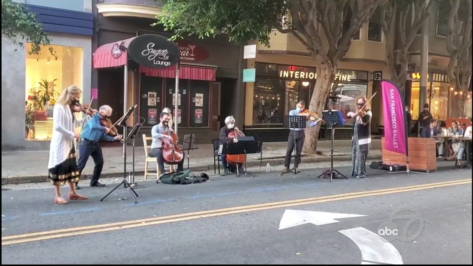 The performers you see belong to the orchestra of the San Francisco Ballet, but because of the pandemic, they can't perform inside the War Memorial Opera House. On Friday, they played in front of the Sugar Lounge.