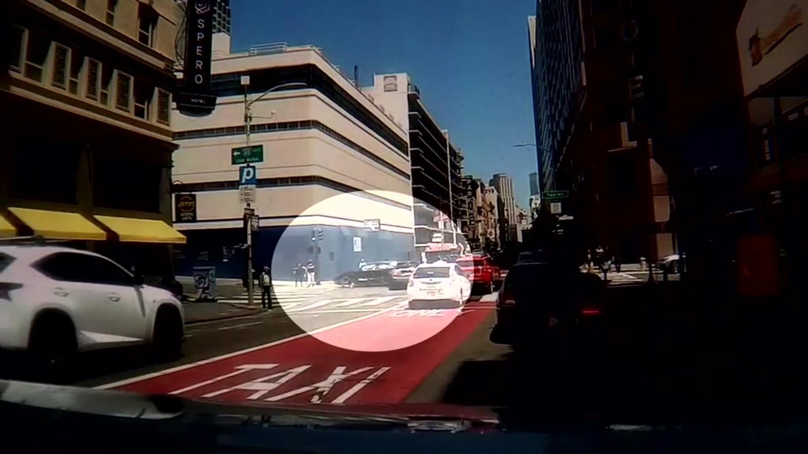 The cars are all moving slowly, at least relative to the Tesla, which is seen speeding up Taylor, through a red light at O'Farrell.