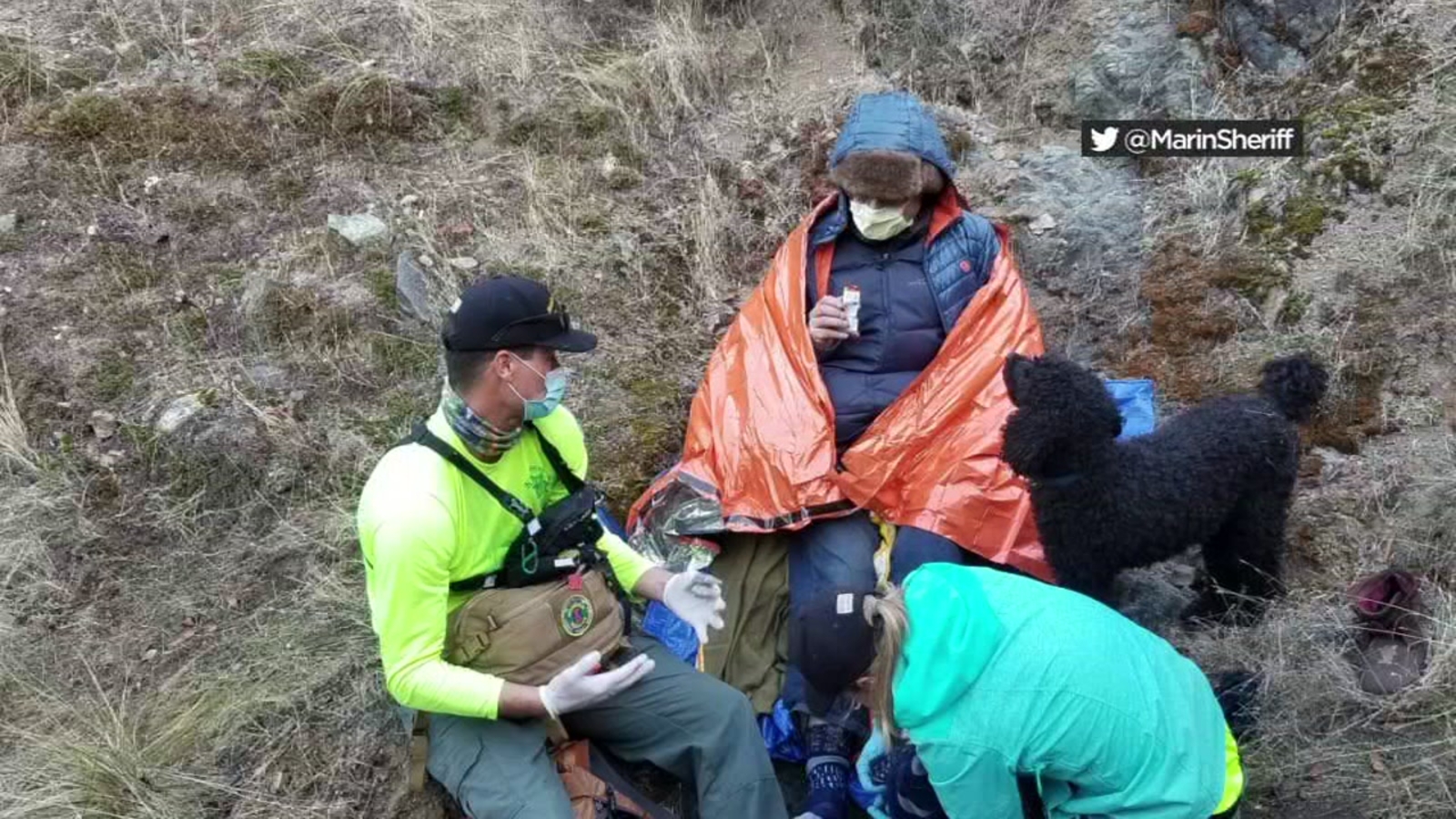 The hiker, who was not publicly identified, and his dog Yarrow were hiking in that area late Saturday afternoon. When they did not return home by nightfall, a search was mounted quickly by the Fairfax Police Department and the Marin County Open Space District.