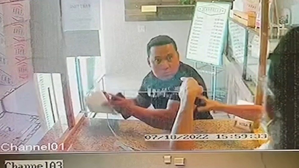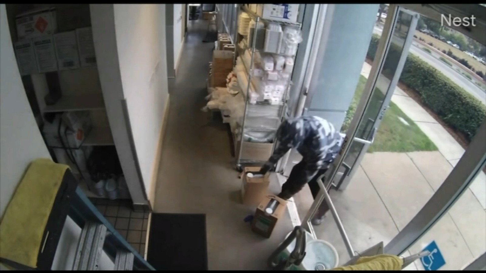 Surveillance from the restaurant shows a man breaking open the lockbox on the front door and looking around in the kitchen. Another video shows him stacking up boxes of iPads and stealing four boxes of cooking oil.