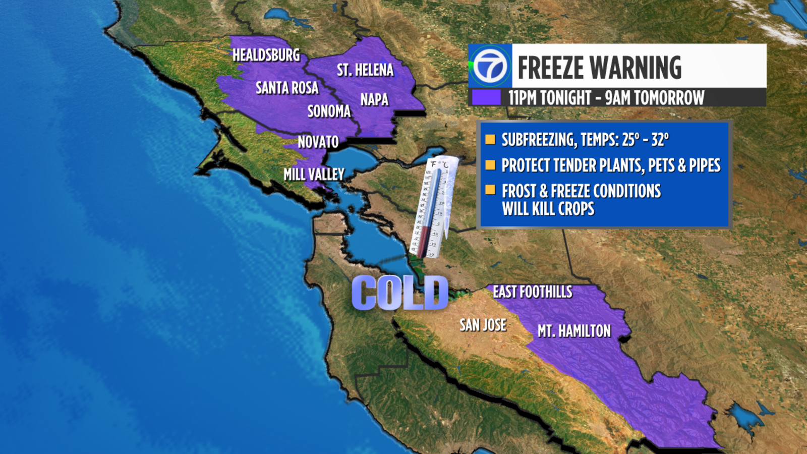 A Freeze Warning is going up for the north bay valleys and mountains and also the eastern Santa Clara hills.