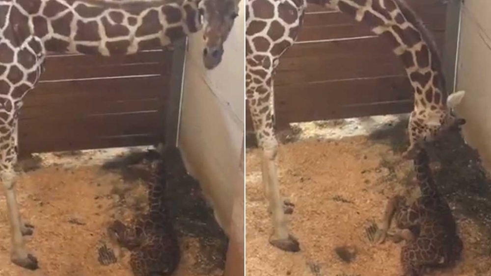 Keepers found April in labor around 11 a.m. local time, when the calf's hooves and almost a foot of his leg had already emerged. The giraffe was born at 12:43 pm, stood up by 1:27 p.m. and was nursing by 1:51 p.m.