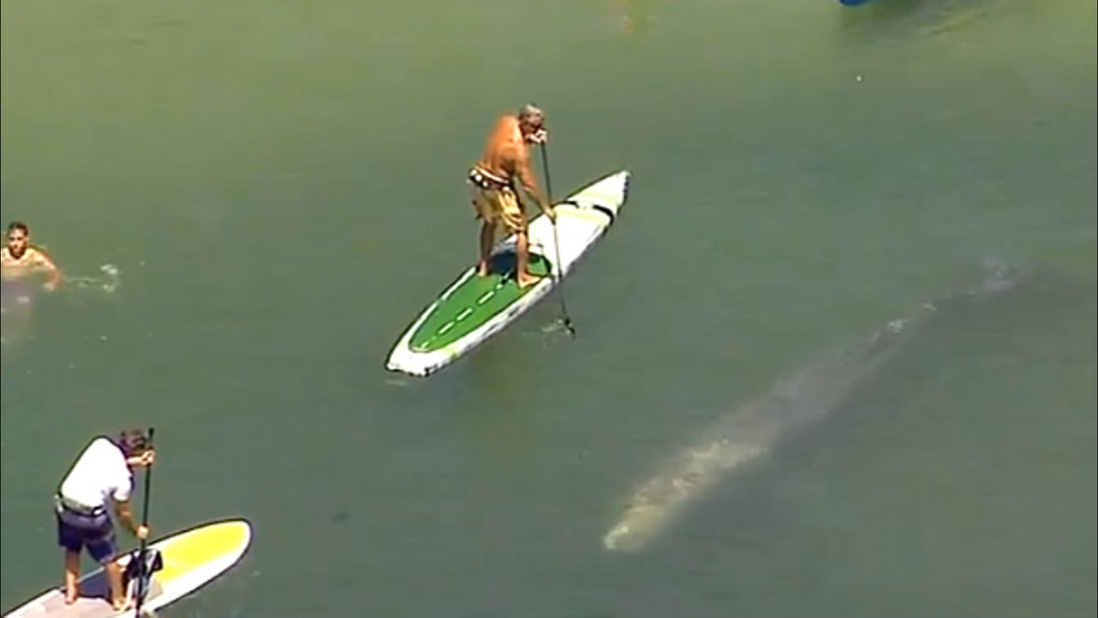 The whale didn't seem to be in any obvious distress, though it was getting pretty close to shore. It swam directly under several paddleboarders and kayakers.