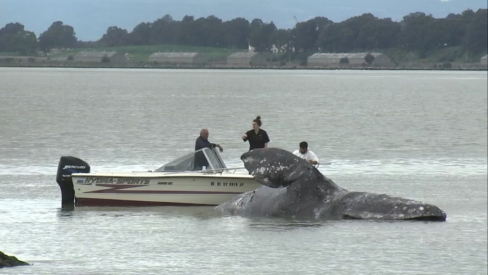 CONTRA COSTA COUNTY, Calif. (KGO) -- Investigators with the Marine Mammal Center are in Rodeo Wednesday night, looking for what killed a baby whale that washed ashore in San Pablo Bay.