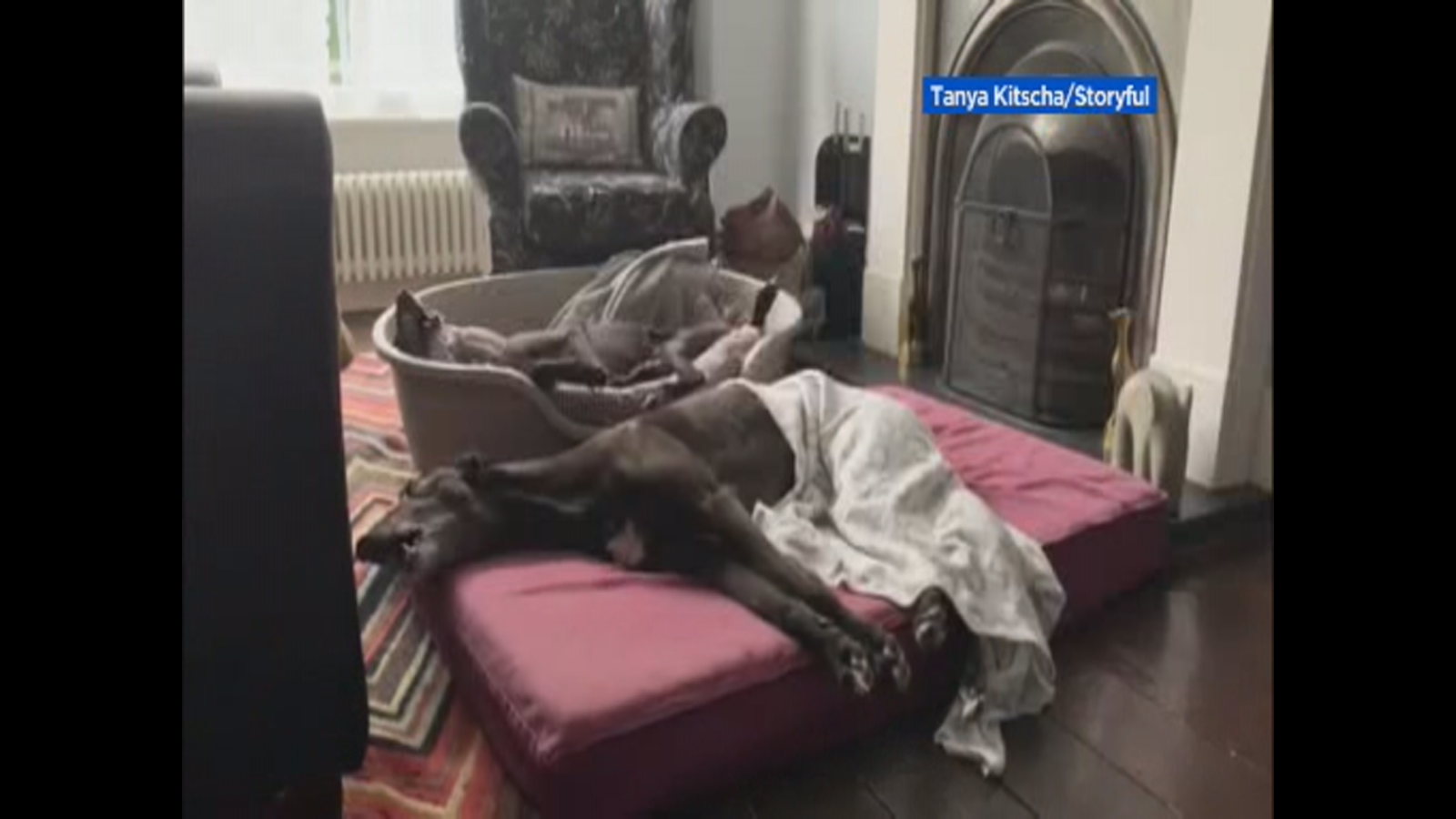 HERTFORDSHIRE, England (KGO) -- Why are two retired greyhounds whining in unison?