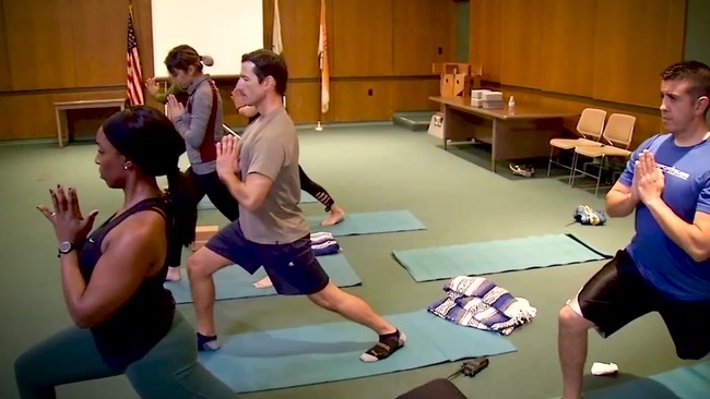 This is a unique yoga class. It's being taught at an East Bay police department. Cops in child's pose.