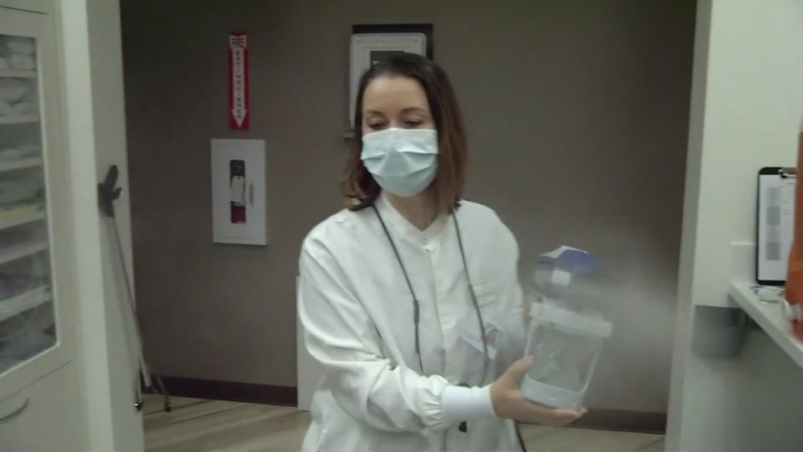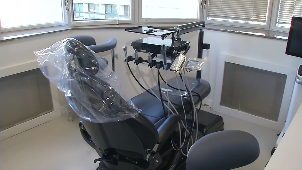She does this in hopes to disinfect any COVID-19 aerosols that might be in the room. Once with a patient, she adds an inside the mouth suctioning device and a second device outside the room to catch any questionable particles.
