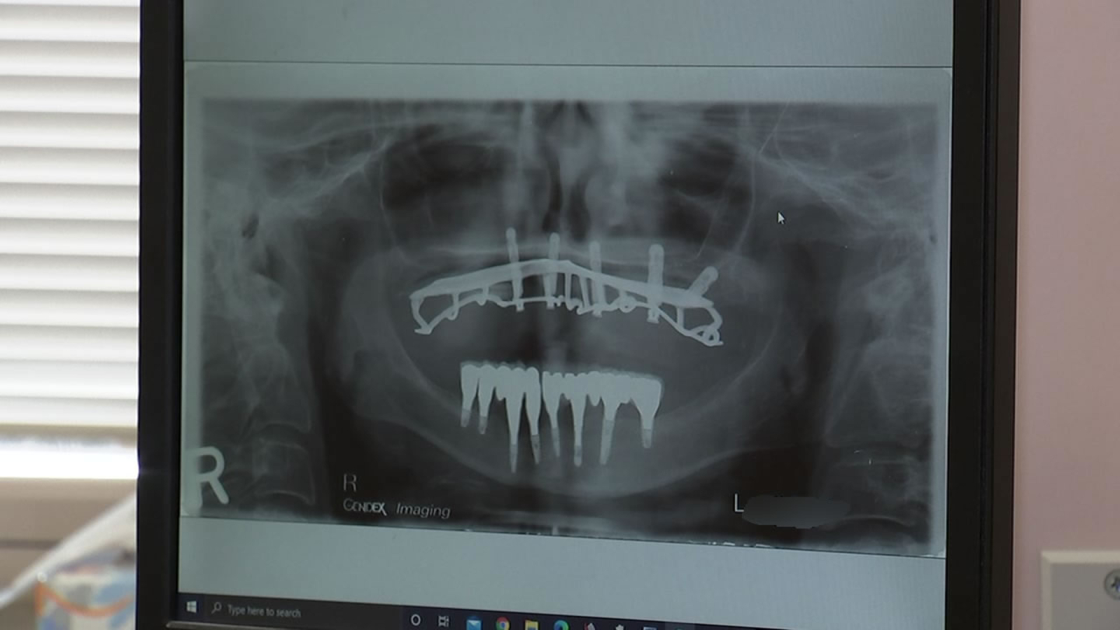 "Our patients that we're seeing have very unusual fractures," said Dr. Mueller, pointing to a photo of an otherwise completely healthy tooth, split in half. "It's tremendous force to cause that kind of fracture of your own teeth."