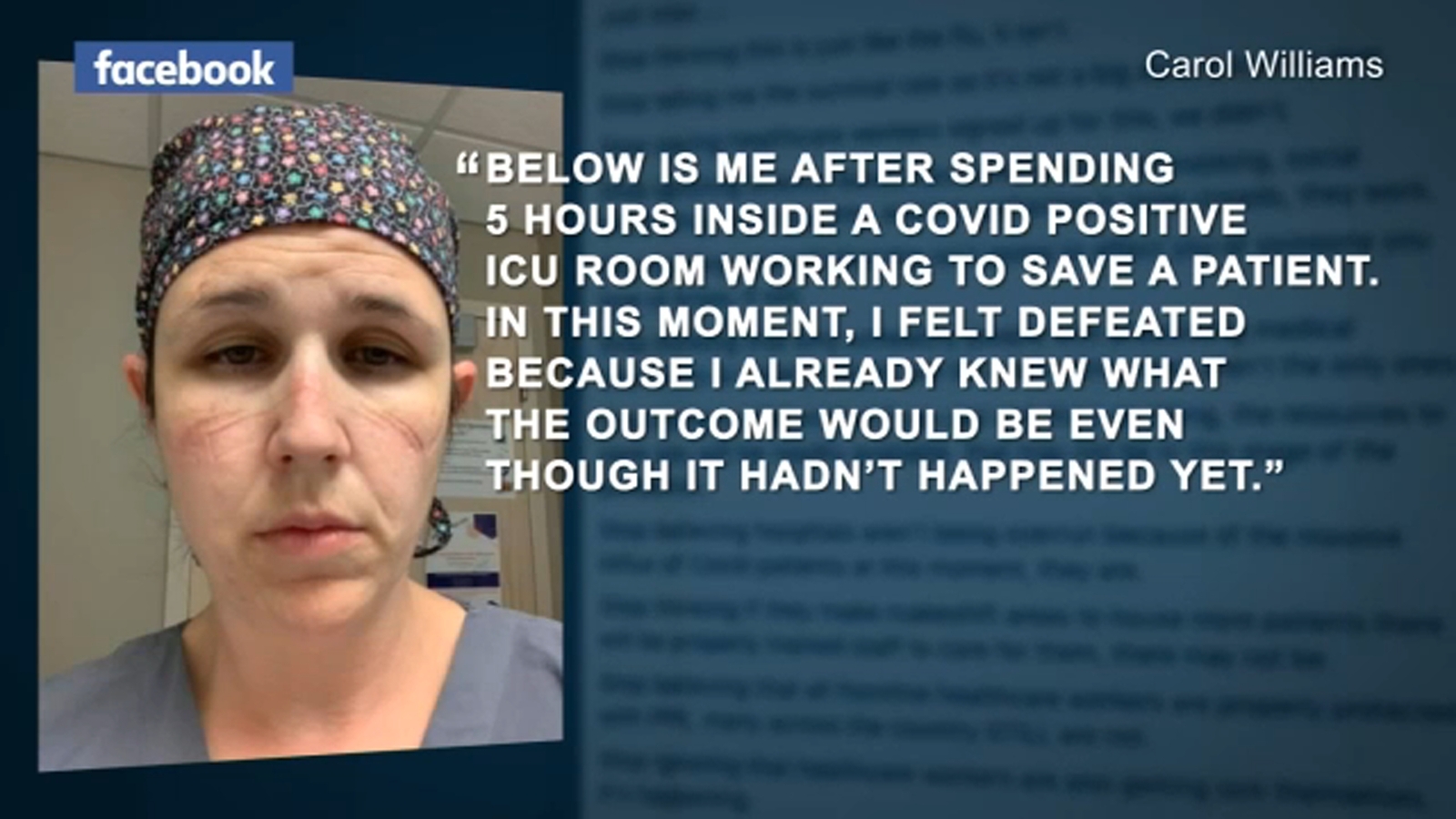 Nurse Carol Williams shared a photo of herself on Facebook after her shift at Rush-Copley Medical Center in Aurora with a powerful message that has since gone viral: