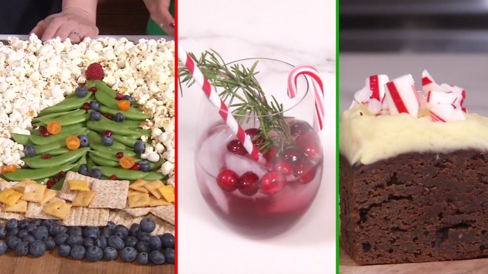 1. Make veggies festive. Check out Lee's Festive Snack Tray featuring snap peas for the Christmas tree, blueberries and cherry tomatoes for the lights and ornaments and popcorn for snow.