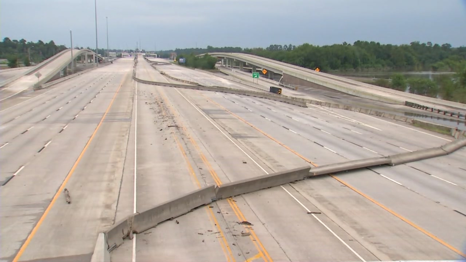 In the Texas town of Humble, we're getting an incredible look at the power of the floodwaters. About 150 yards of a concrete median on the Eastex Freeway (U.S. Route 59) was thrust aside as if it was a tinker toy.