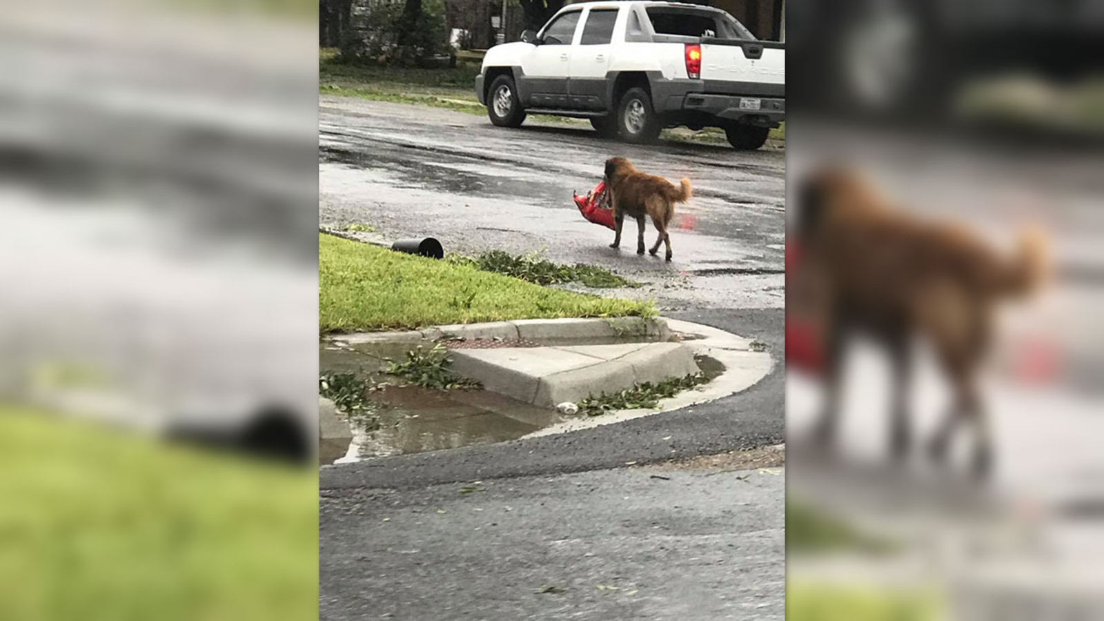 A Facebook post showing a lost dog trotting with a bag of dog food in his mouth is gaining traction the morning after Harvey's landfall on the central Texas coast.