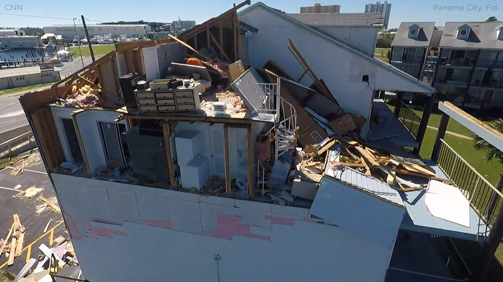 Drone footage captured by a CNN crew showed one Panama City family picking through the wreckage on the upper floor of their badly damaged home. Part of the building's roof and ceilings had been completely ripped off by the storm, leaving the home's interior rooms clearly visible from the outside.