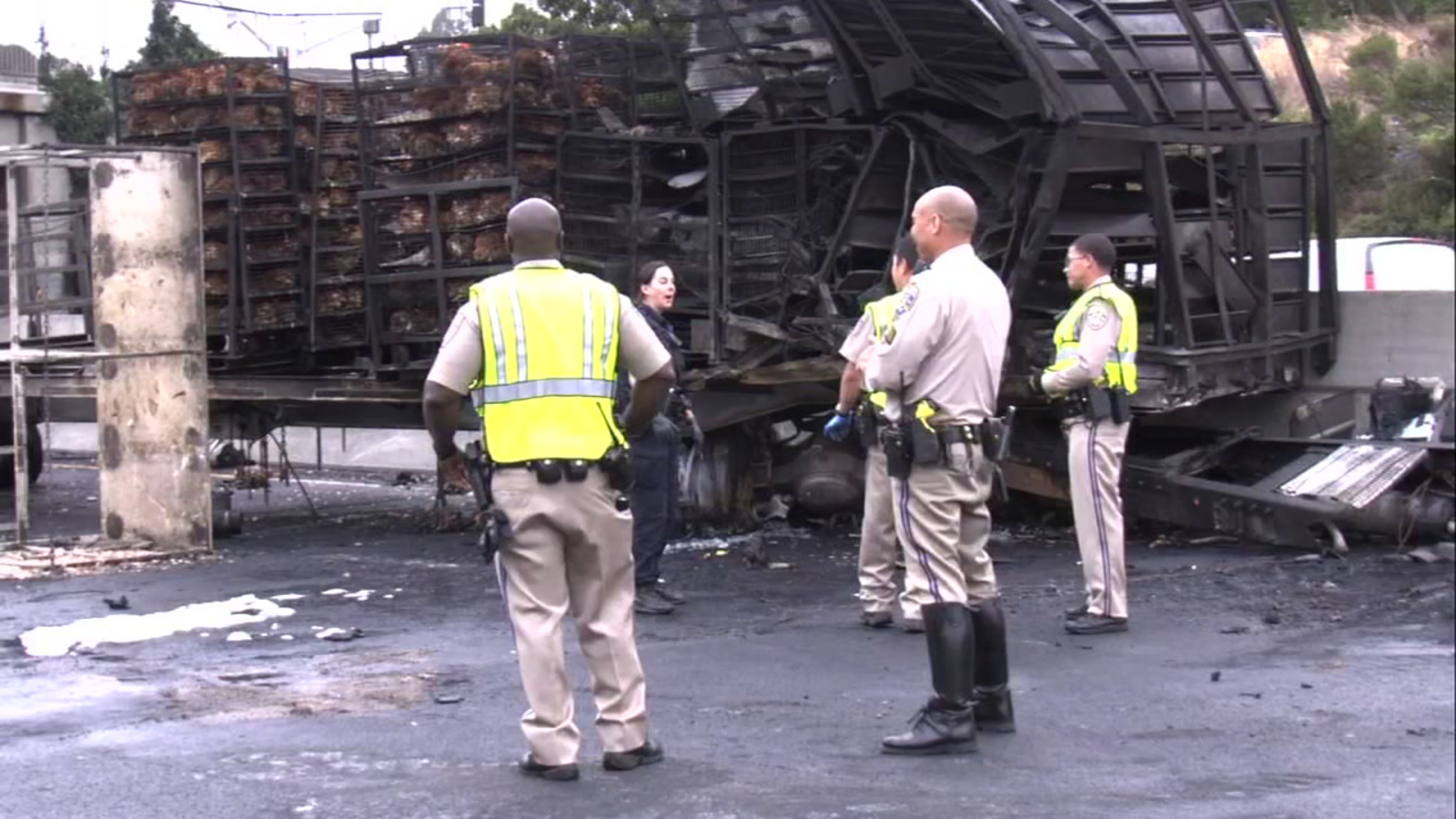 The call came in just after 3:30 a.m. that the big rig was on fire. Once the fire was out and the driver was taken to the hospital, officers realized there were hundreds of chickens that survived and needed rescuing. CHP officers were carrying chickens off the burned rig or were chasing the loose ones that managed to escape.