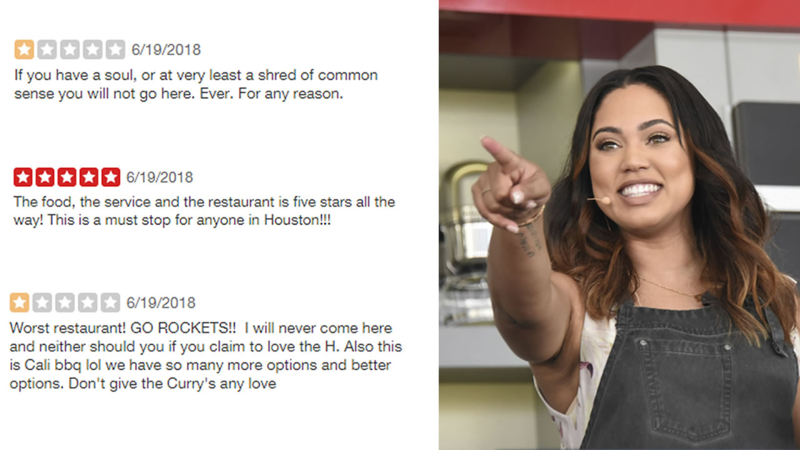 Some people who hated on Ayesha's restaurant weren't even from Houston, like Dominic H. from Wisconsin who said, "If I wanted to have a terrible time I would just turn on a Warriors game."