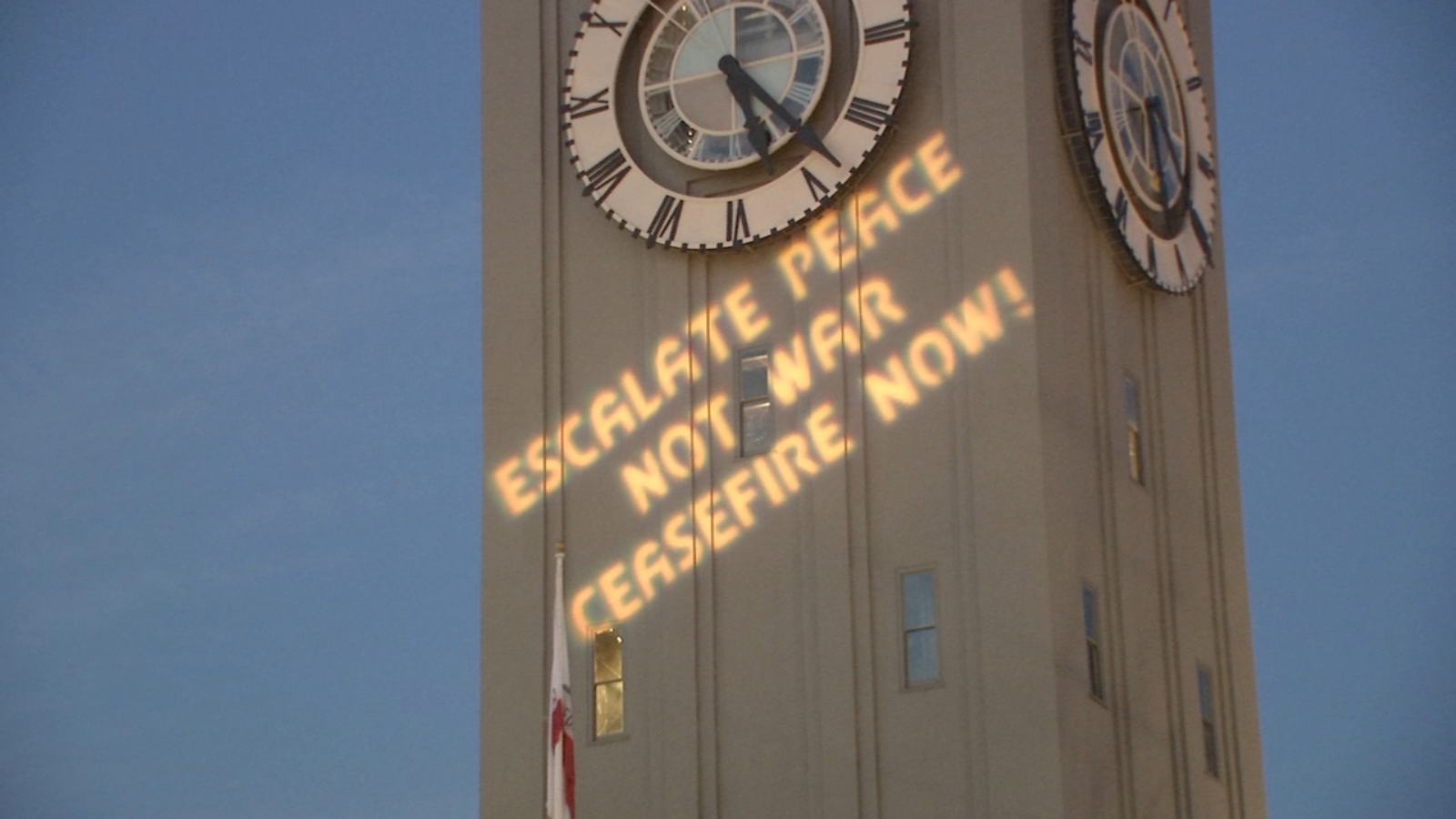The projection on the clock tower of the Ferry Building said "Escalate peace not war ceasefire now!"